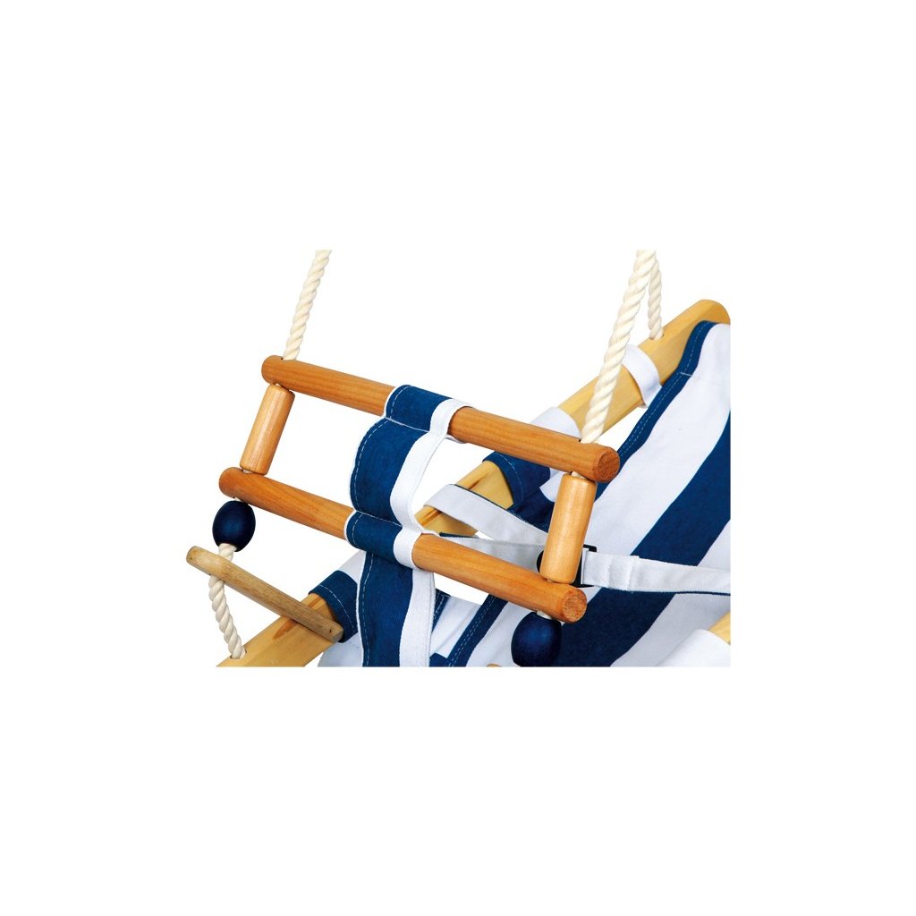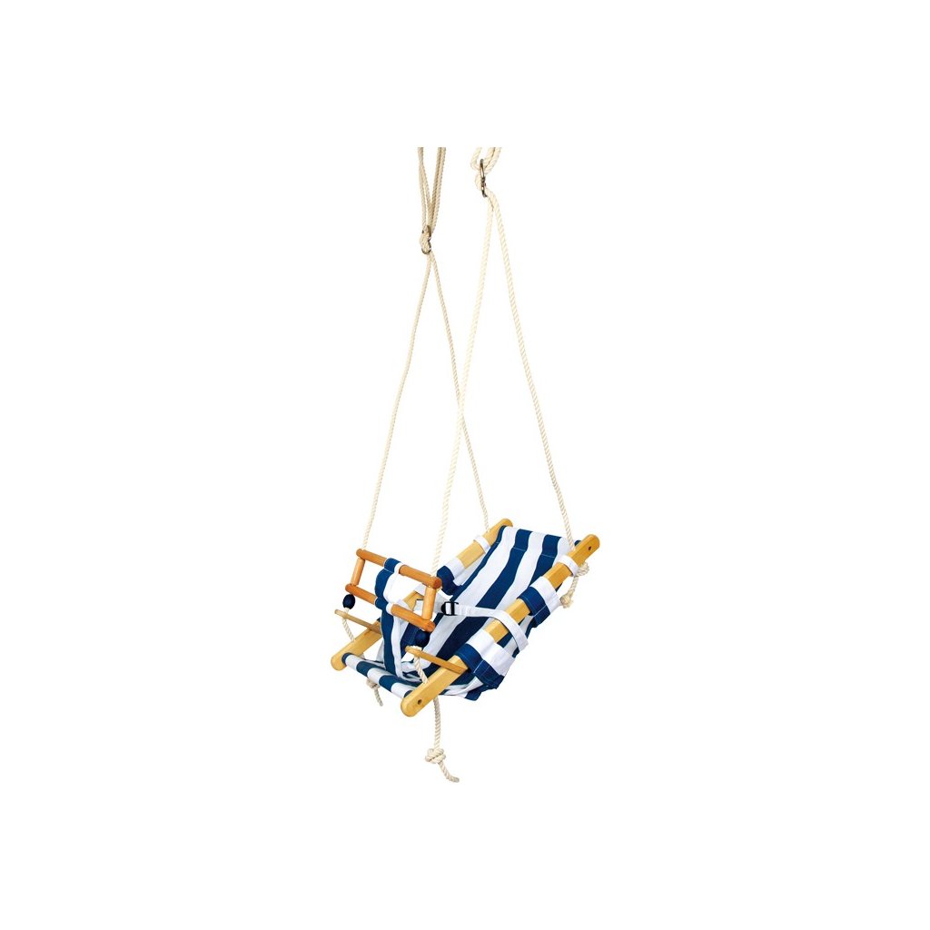 BABY-Schaukel für die KleinstenDie komfortable Kinderschaukel für die Kleinsten besteht aus einem massiven, glatt geschliffenen Holzrahmen und einem wetterfesten Textilmaterial in Blau und Weiß.