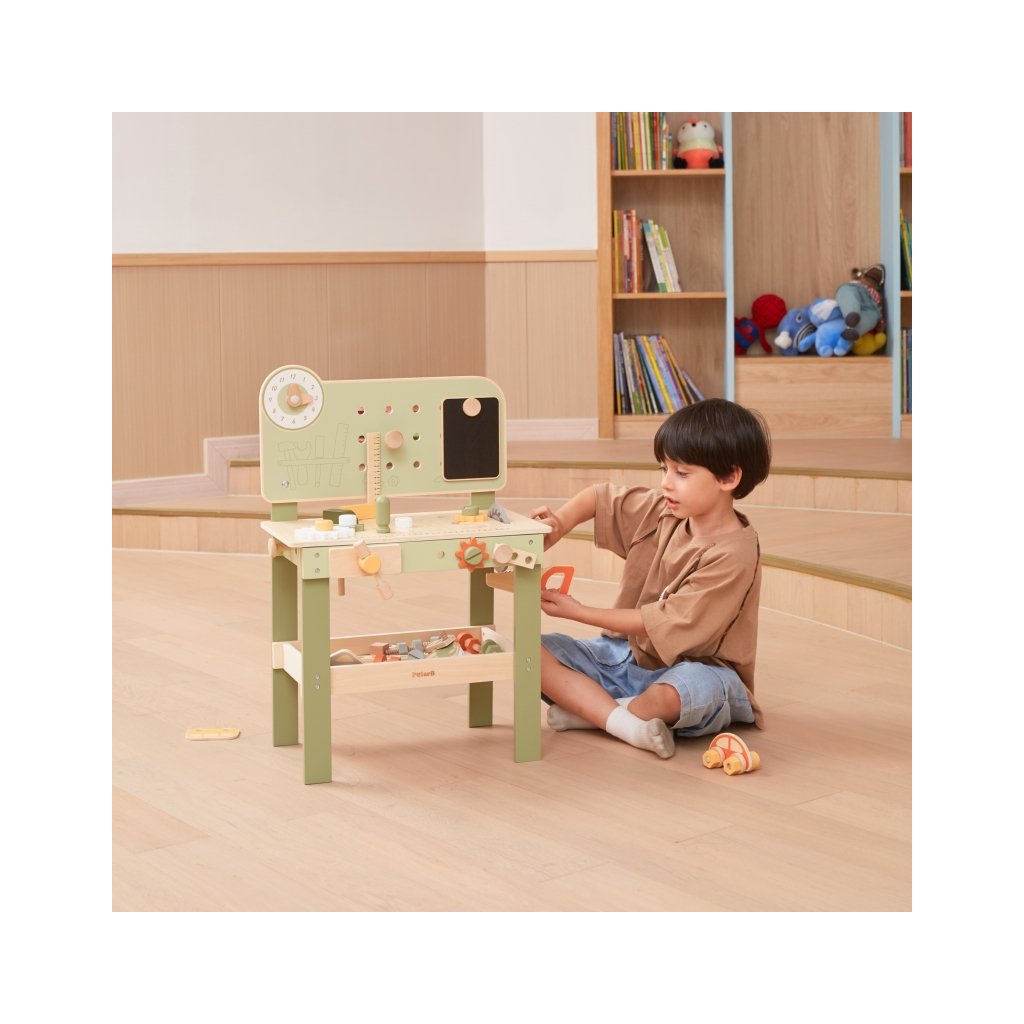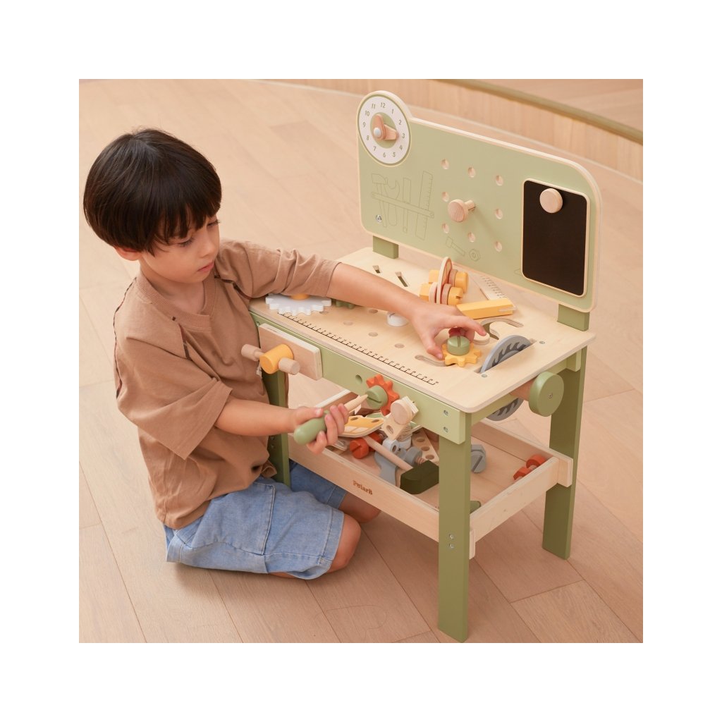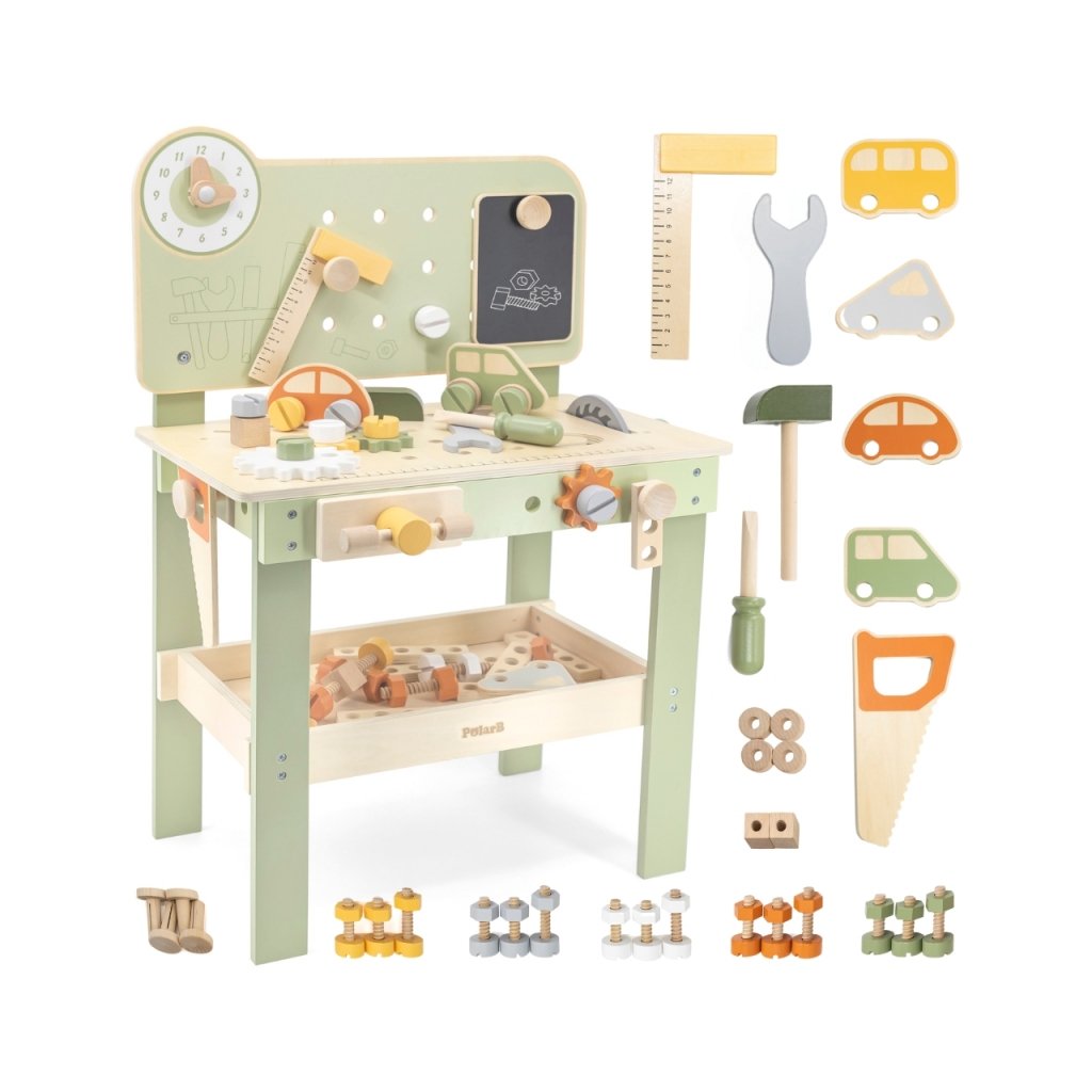 Tento ponk přichází s opravdovou sadou „nástrojů“ – kladivem, šroubováky, klíčem, šroubky, maticemi, ozubenými koly a dalšími díly, které děti mohou „montovat“, šroubovat, zatloukat a skládat. Součástí dílny je i pracovní plocha s možností upevnění desek a ozubených částí, což děti učí koordinaci, prostorovému vnímání a rozvíjí jejich jemnou motoriku.