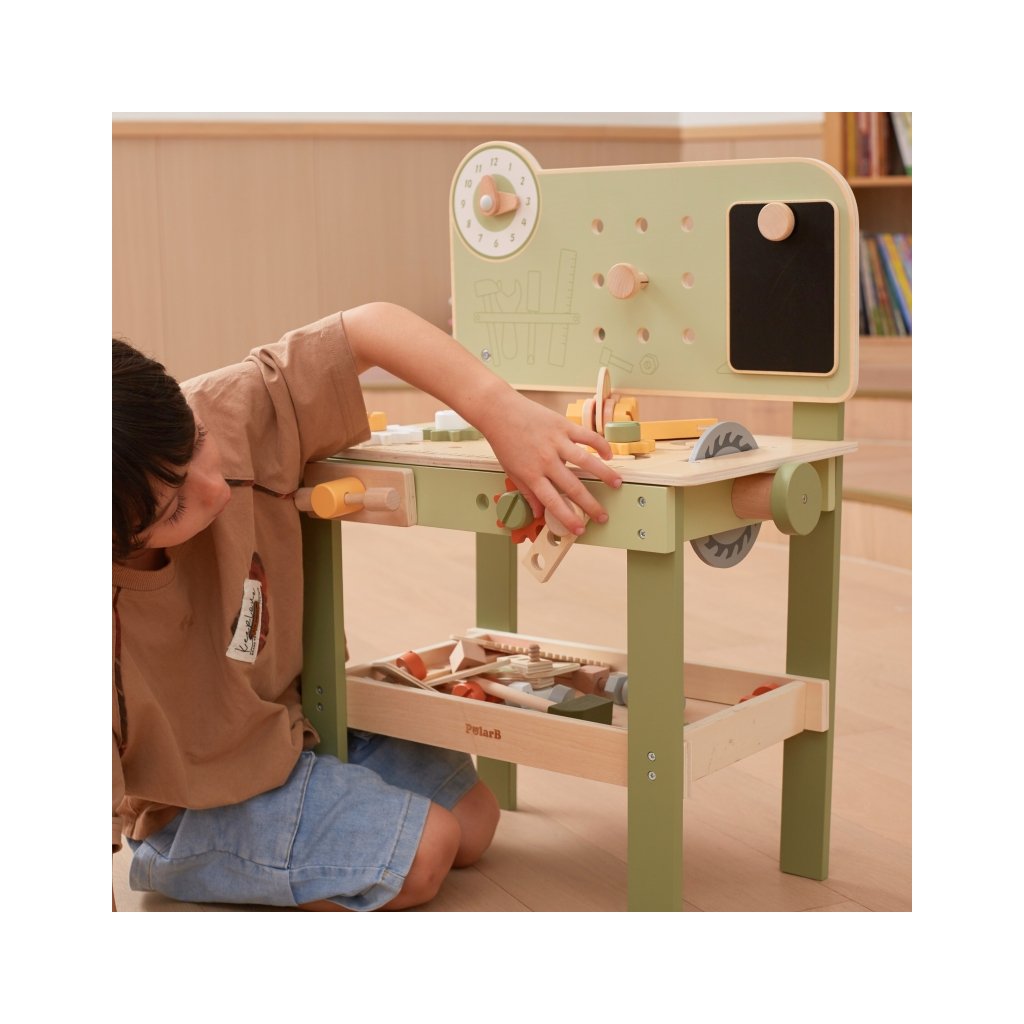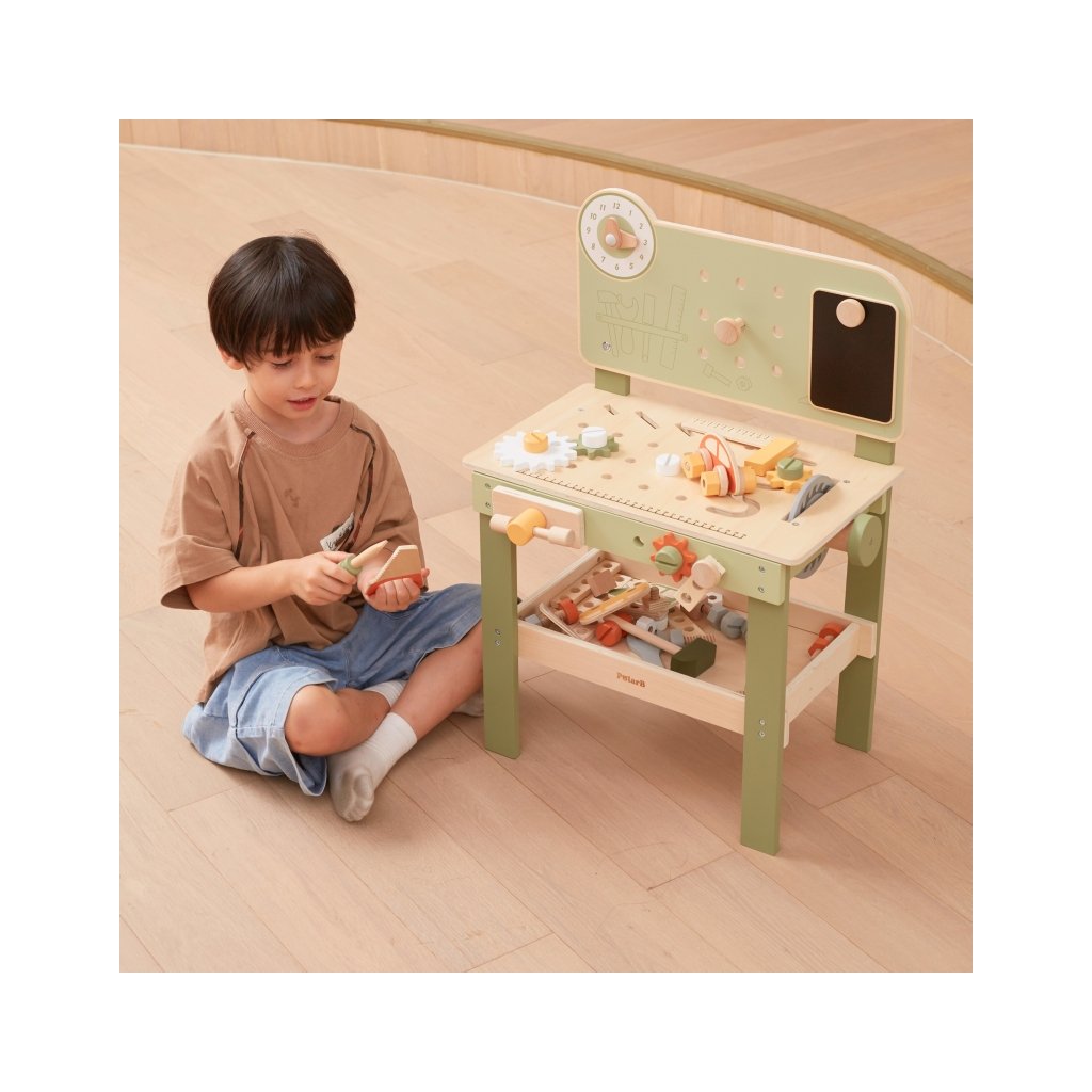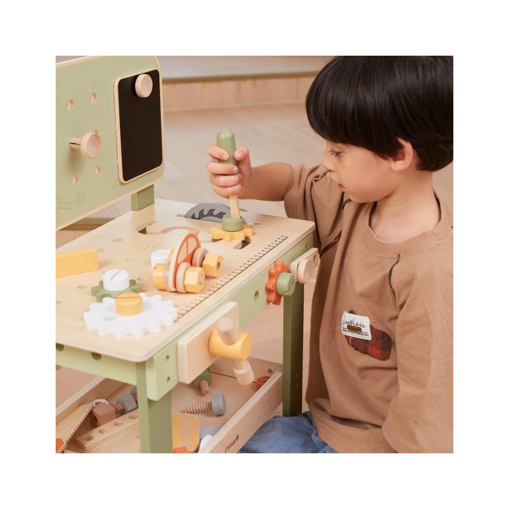 Tento ponk přichází s opravdovou sadou „nástrojů“ – kladivem, šroubováky, klíčem, šroubky, maticemi, ozubenými koly a dalšími díly, které děti mohou „montovat“, šroubovat, zatloukat a skládat. Součástí dílny je i pracovní plocha s možností upevnění desek a ozubených částí, což děti učí koordinaci, prostorovému vnímání a rozvíjí jejich jemnou motoriku.