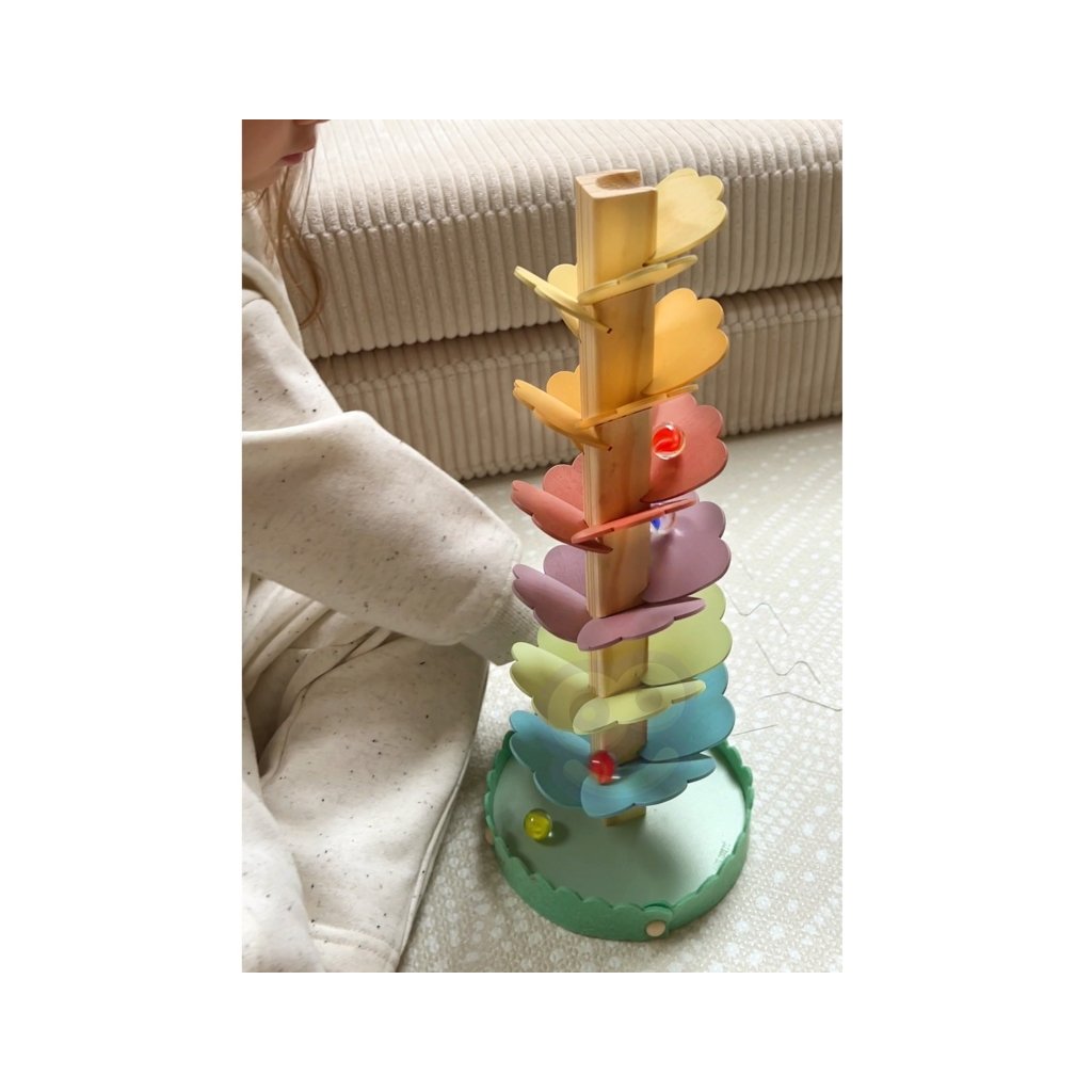 Dřevěná spirálová věž pro nekonečnou zábavu. Tato sada se skládá z 20 barevných dílů, které může batole snadno uspořádat, a 6 kuliček. Pošlete kuličku jednu po druhé z nejvyšší úrovně a sledujte, jak se kutálejí. Kuličková věž je skvělou zábavou, ale také vynikající vzdělávací nástroj. Děti se učí základní fyzikální zákony, logiku, ale také si procvičují koordinaci ruka-oko. Celou hru navíc doprovázejí příjemné zvuky – když kulička padá po dřevěných příčkách.