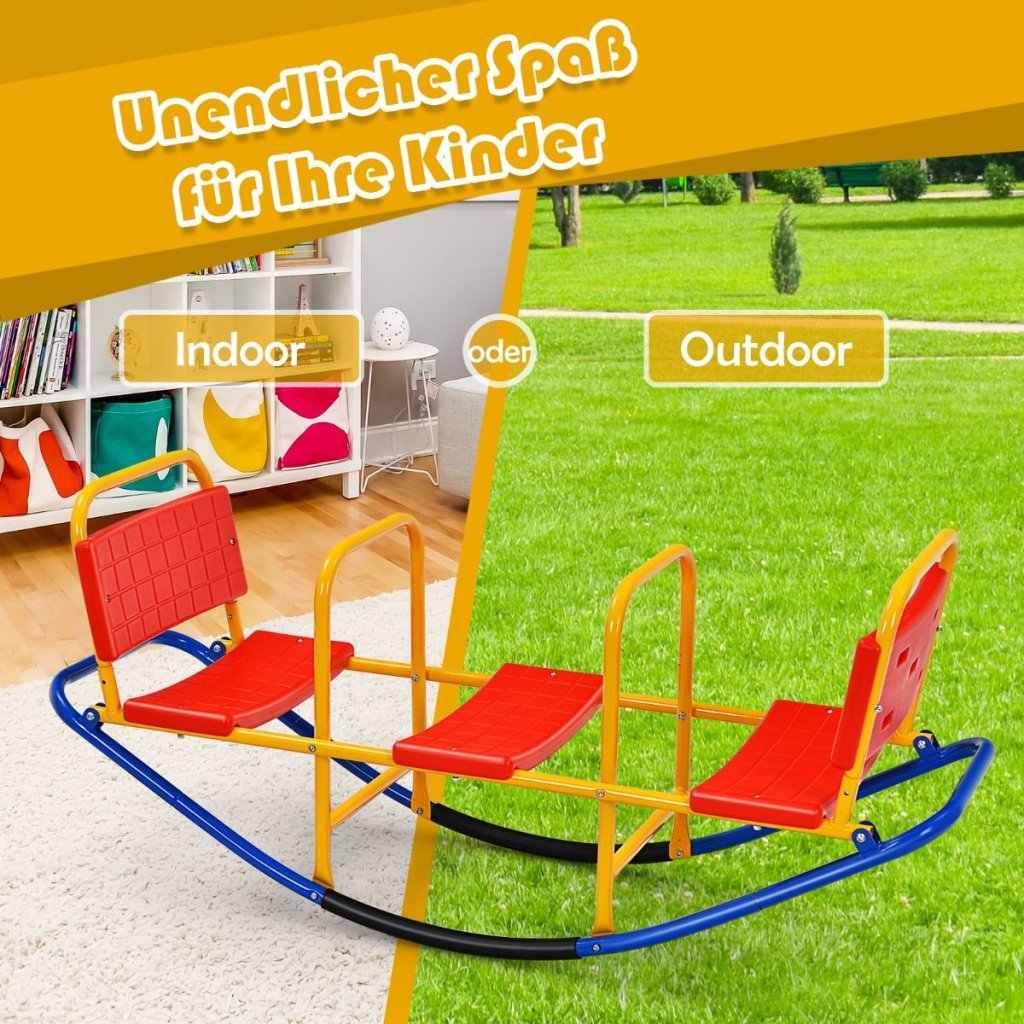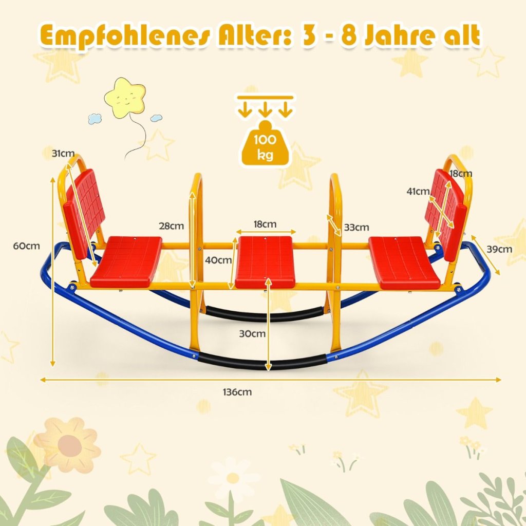Im Gegensatz zu den meisten Schaukeln hat dieses Modell 3 Sitze und ist daher für mehrere Kinder geeignet. Dies fördert die Teamarbeit, die sozialen Fähigkeiten und das Gleichgewicht im Spiel.