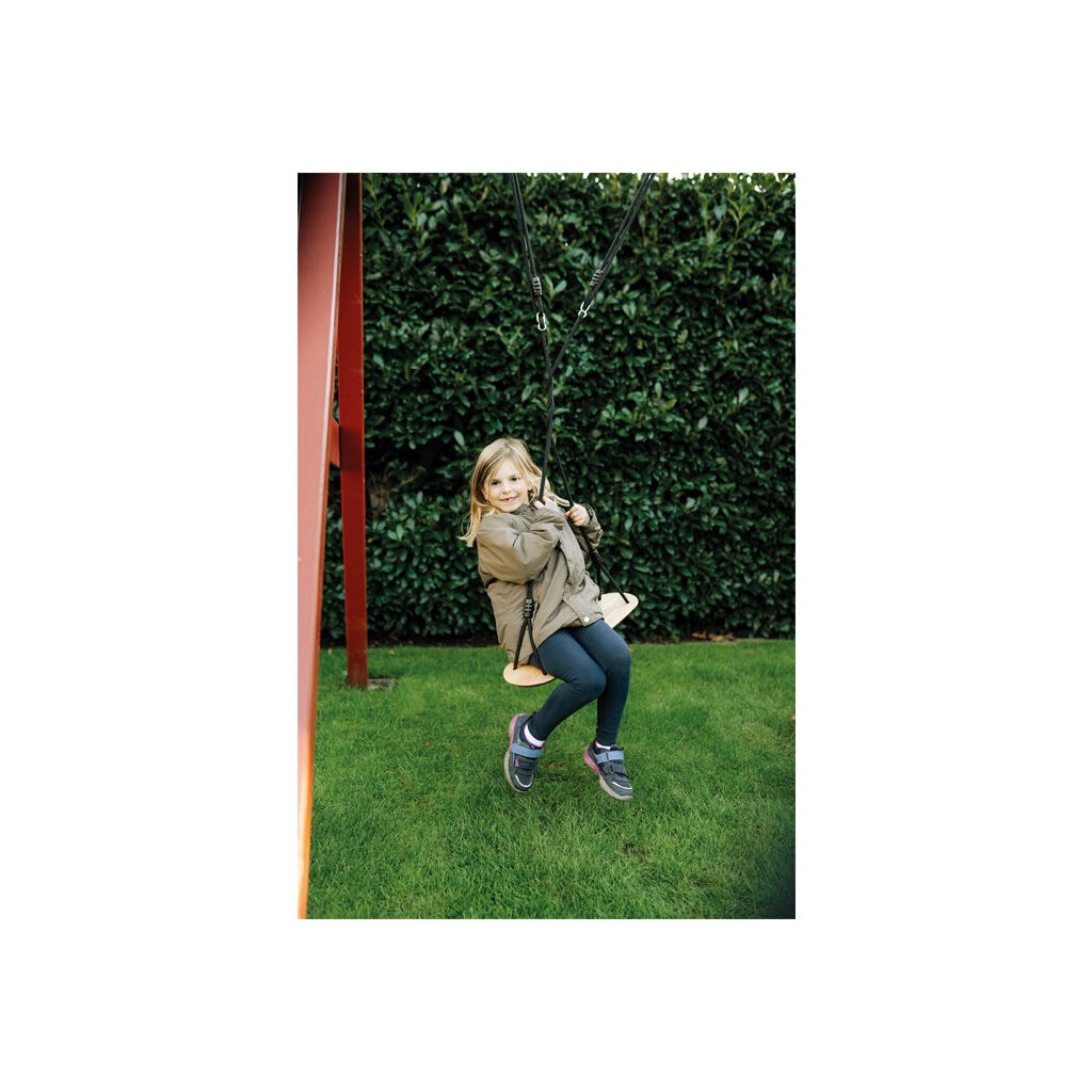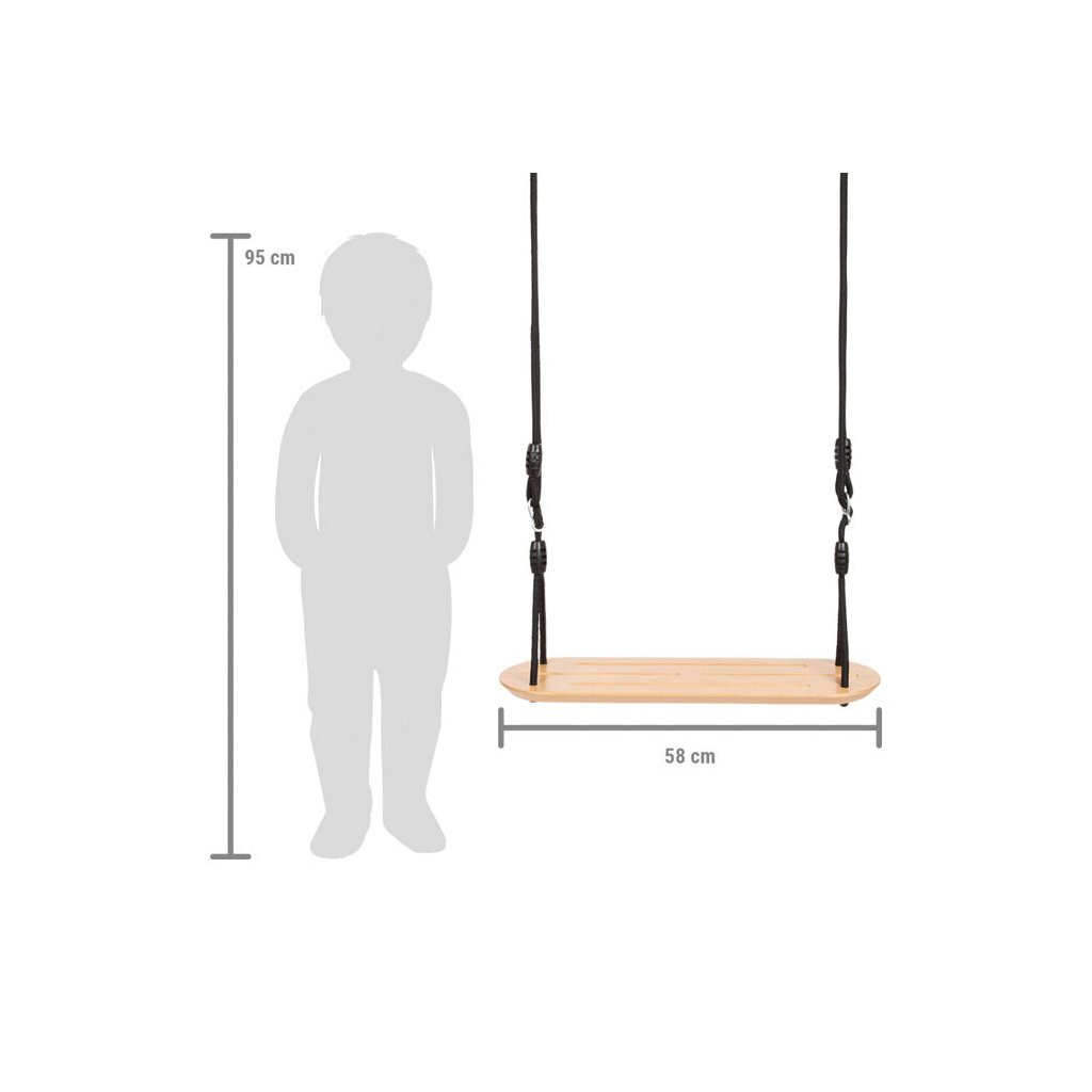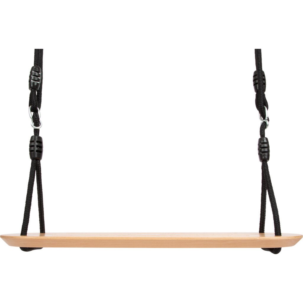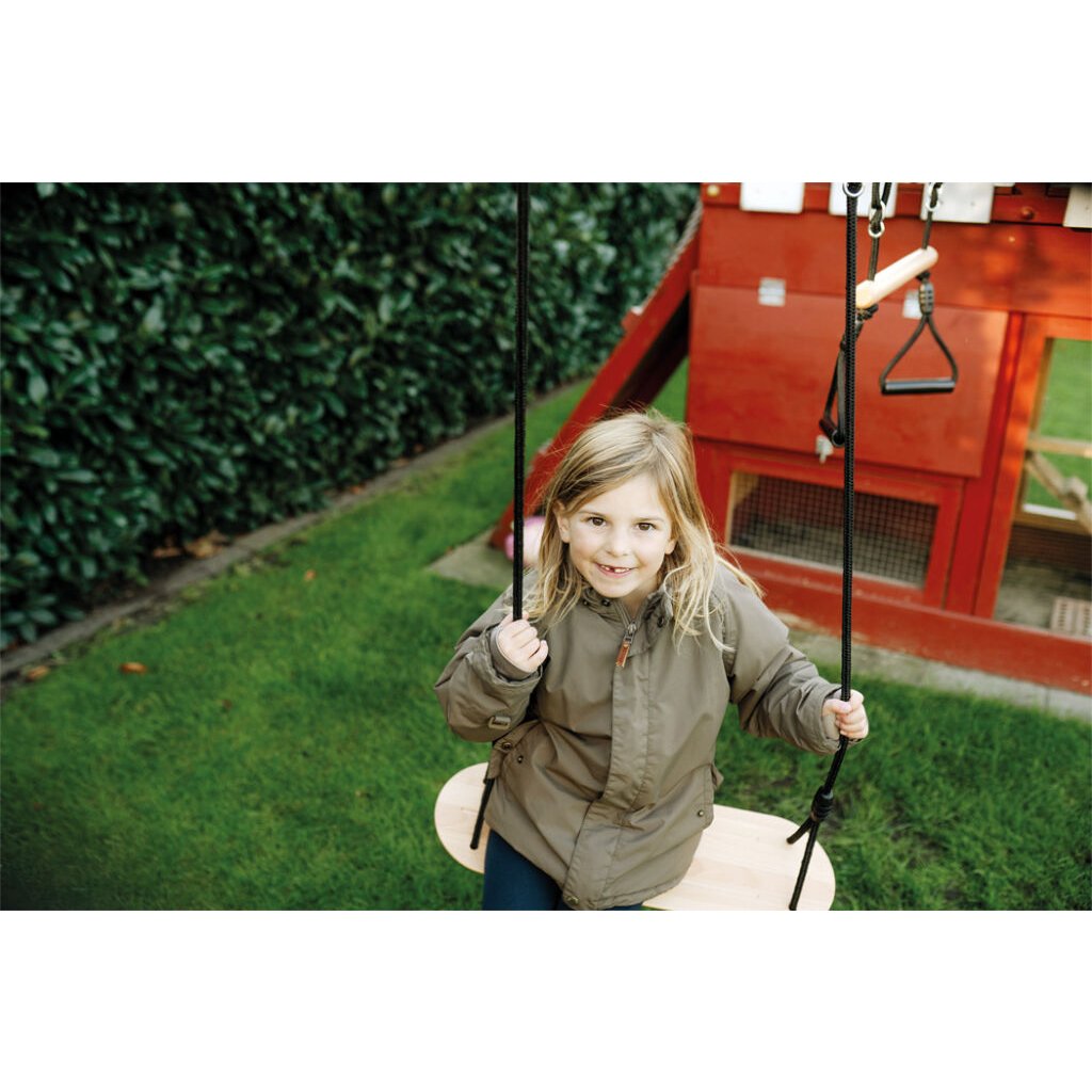 Fliege hoch in die Wolken. Diese schöne und geräumige Holzschaukel ist eine klassische Schaukel, die sich dank des natürlichen Holzes in Kombination mit schwarzen Seilen durch ihr hochwertiges Aussehen auszeichnet. Die robusten Seile sind höhenverstellbar. Mit dem Metallring kann die Schaukel schnell auf- und abgehängt werden. Er ist aus robustem Massivholz und wetterfestem Seil gefertigt und für drinnen und draußen geeignet.Dank seiner großen Sitzfläche und Ladekapazität ist er auch für Erwachsene geeignet. Es trainiert Körperbeherrschung, Kraft und Beweglichkeit. Wer kann am höchsten schwingen? Rillen auf der Sitzfläche sorgen dafür, dass die Schaukel rutschfest und sicher ist.