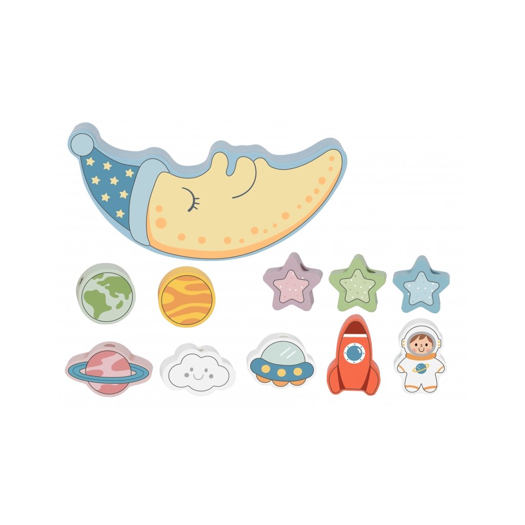 Probuďte představivost malého kosmonauta s montessori balanční sadou. První část spočívá v pečlivém skládání barevných dřevěných destiček — kupříkladu rakety, astronauta, planety, hvězdiček, obláčku — na obličej měsíce tak, aby zůstala stabilní a nedošlo k převrácení. Je to skvělý trénink trpělivosti, preciznosti a smyslu pro rovnováhu.