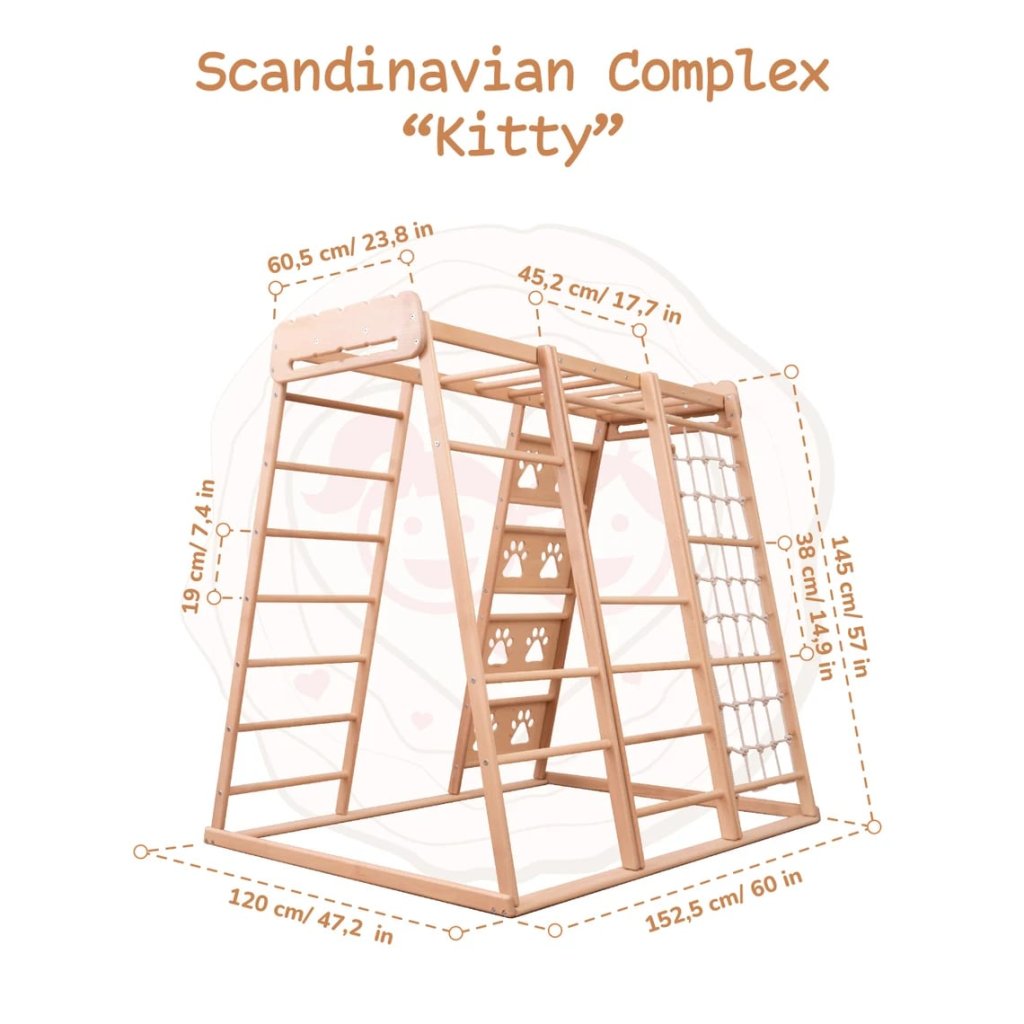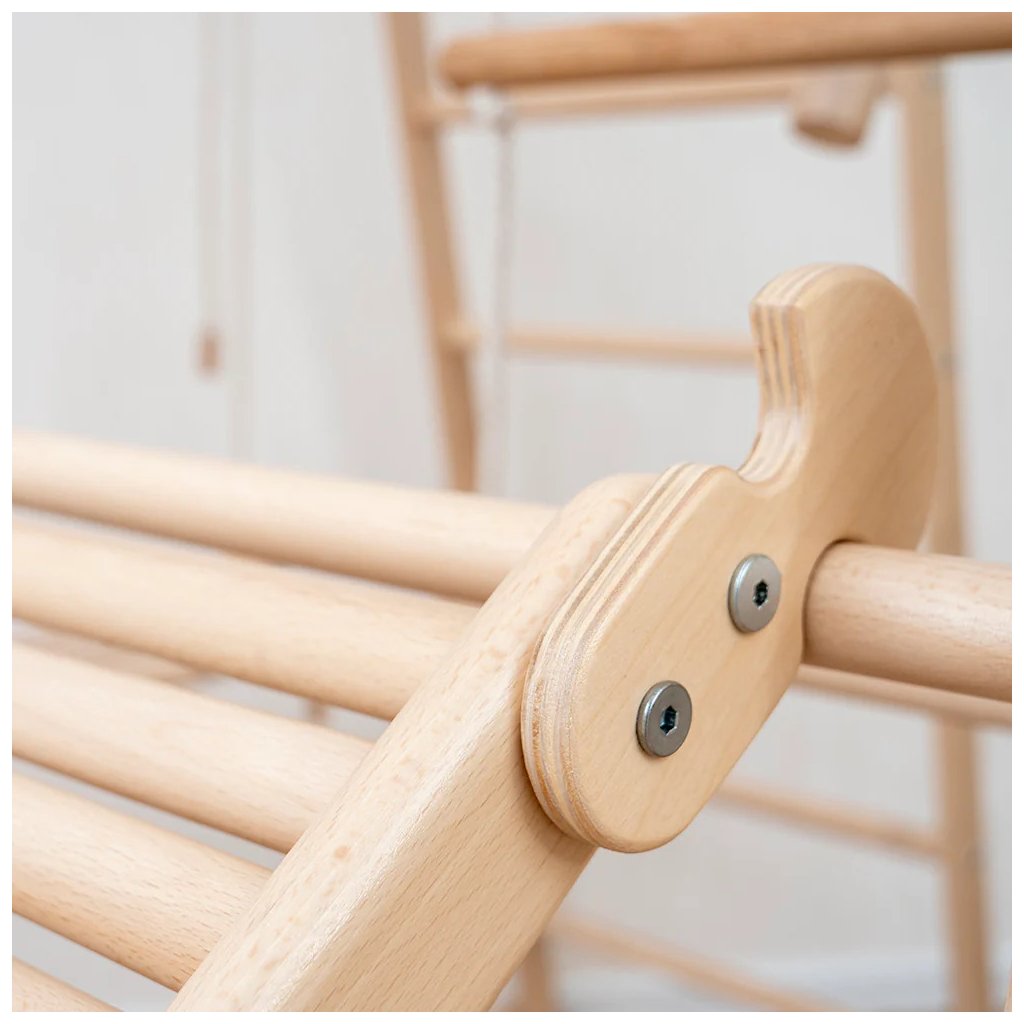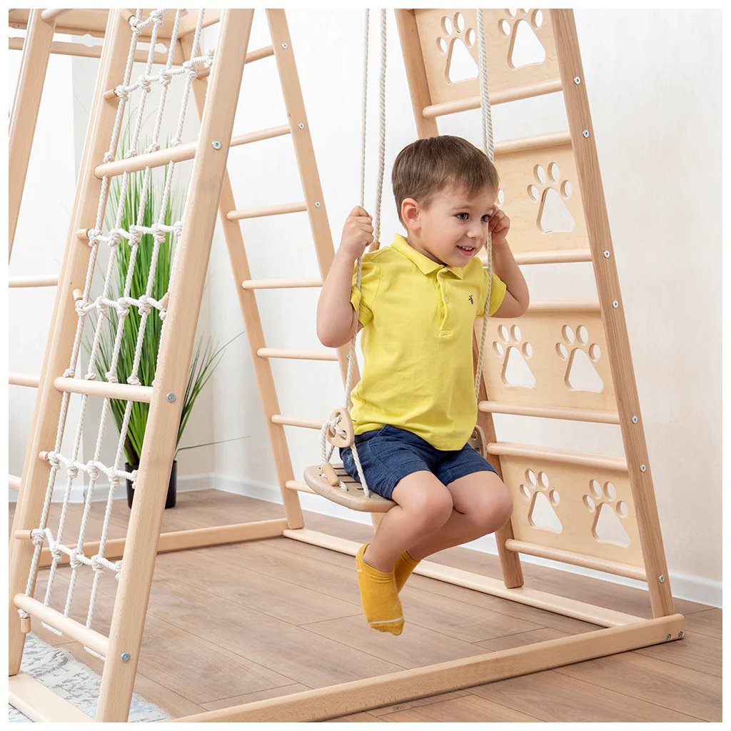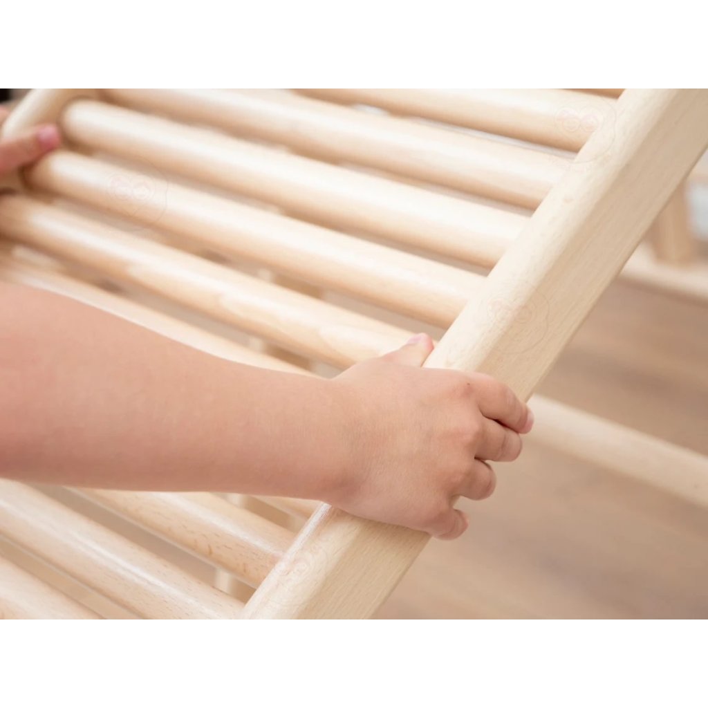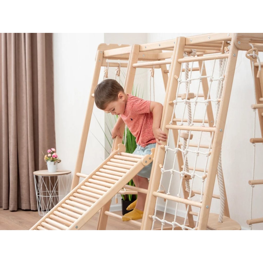 Montessori dětský hřiště 6v1 s příčkovou rampou a závěsnými prvky v přírodním provedení je všestranné vnitřní interiérové hřiště navržené tak, aby zapojilo motoriku dětí, kontrolu rovnováhy, koordinaci pohybu a nekočnou fantazii v hraní. Díky své lákavé struktuře poskytuje různé možnosti lezení, šplhání a zdokonalení ve fyzické zdatnosti, díky herním prvkům, které prvek obsahuje.