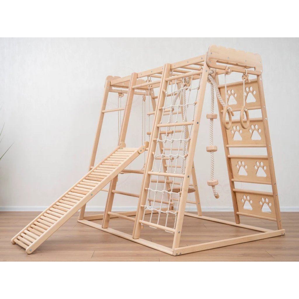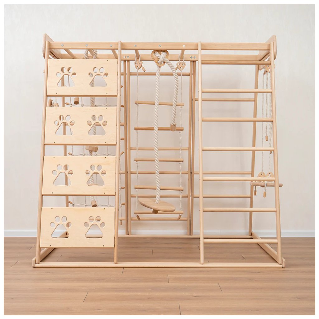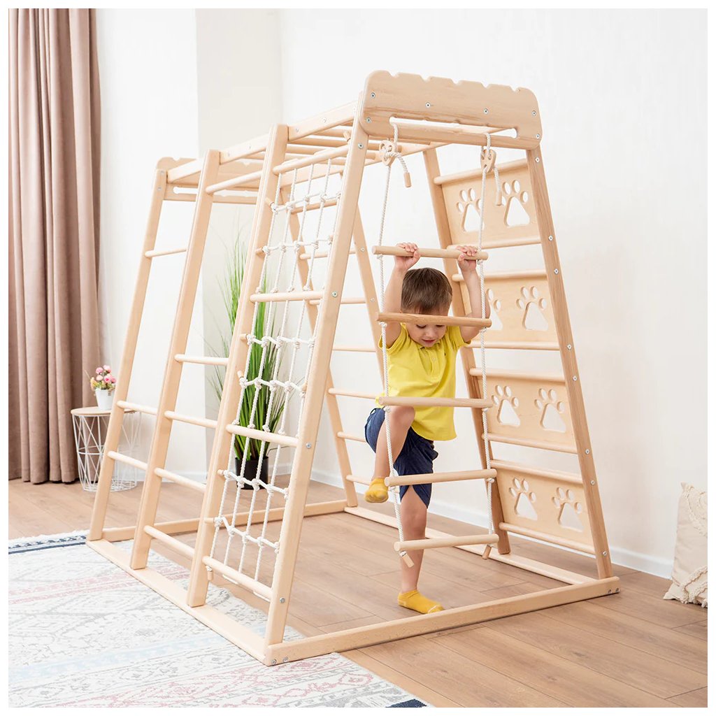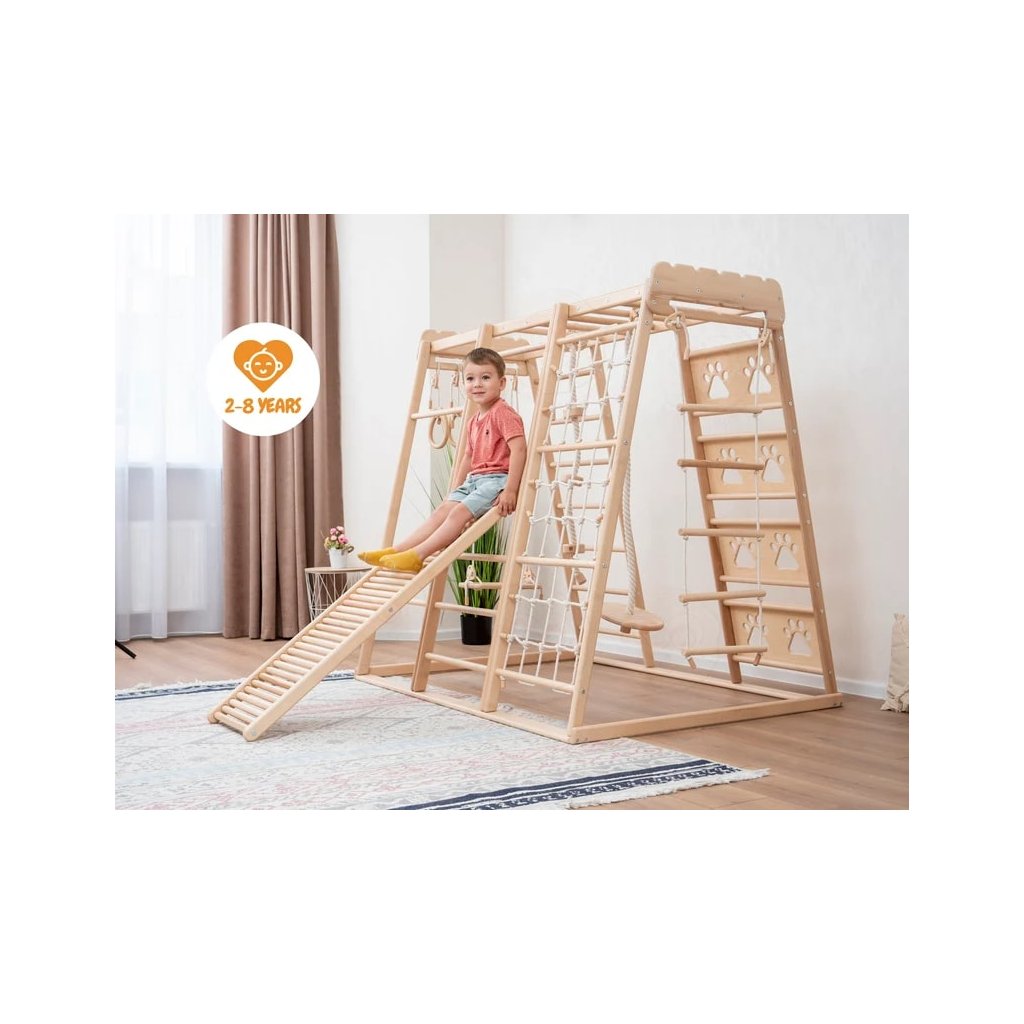 Montessori hřiště 6v1 si děti okamžitě zamilují, je to nekonečné šplhání, lezení, prolézání a navíc má hřiště i oboustrannou masážní rampu z dřevěných příček, kterou po otočení, můžete využít, i jako skluzavku, kterou bezpečně uchytíte k hřišti. Děti si mohou vylézt na hřiště ze dvou protilehlých stran, jedna strana je z dřevěných příček, lanové stěny, a v horní části je dlouhá hrazda pro jednodušší přelezení na vrchní část sestavy, která je také z příček a děti mohou, tak zdokonalovat svoji fyzickou zdatnost uvnitř hřiště na ručkovacím modulu. Z druhé strany mohou vylézt po dřevěných příčkách nebo využít lezecí stěnu, kde je otvor ve tvaru tlapek pro výlez až nahoru. Interierová sestava je plně vybavená, na ručkovací modul jim můžete také připojit gymnastické kruhy, houpací disk, 5 příčkový žebřík nebo závěsné lano s dřevěnými stupni a prostor v sestavě vyplníte bezpečnou matrací, která je také společně se závěsnými prvky součástí sestavy. Dětem můžete závěsné prvky měnit dle jejich oblíbenosti.
