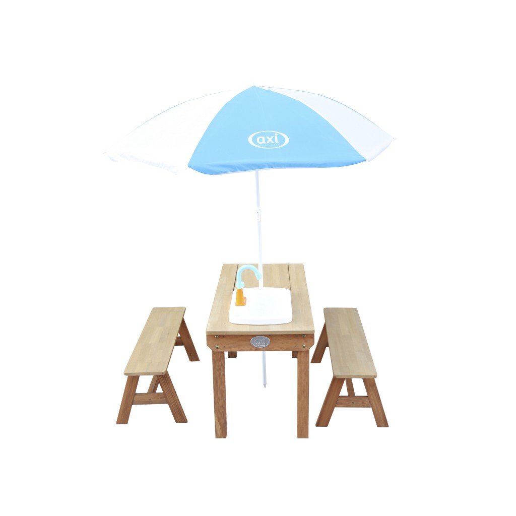 Wenn die Platte abgenommen wird, verbirgt sich hinter dem Tisch ein raffinierter Stauraum. Um Ihre Kinder beim Spielen vor der Sonne zu schützen, wird der Tisch mit einem weiß-blauen, höhenverstellbaren Schirm geliefert.