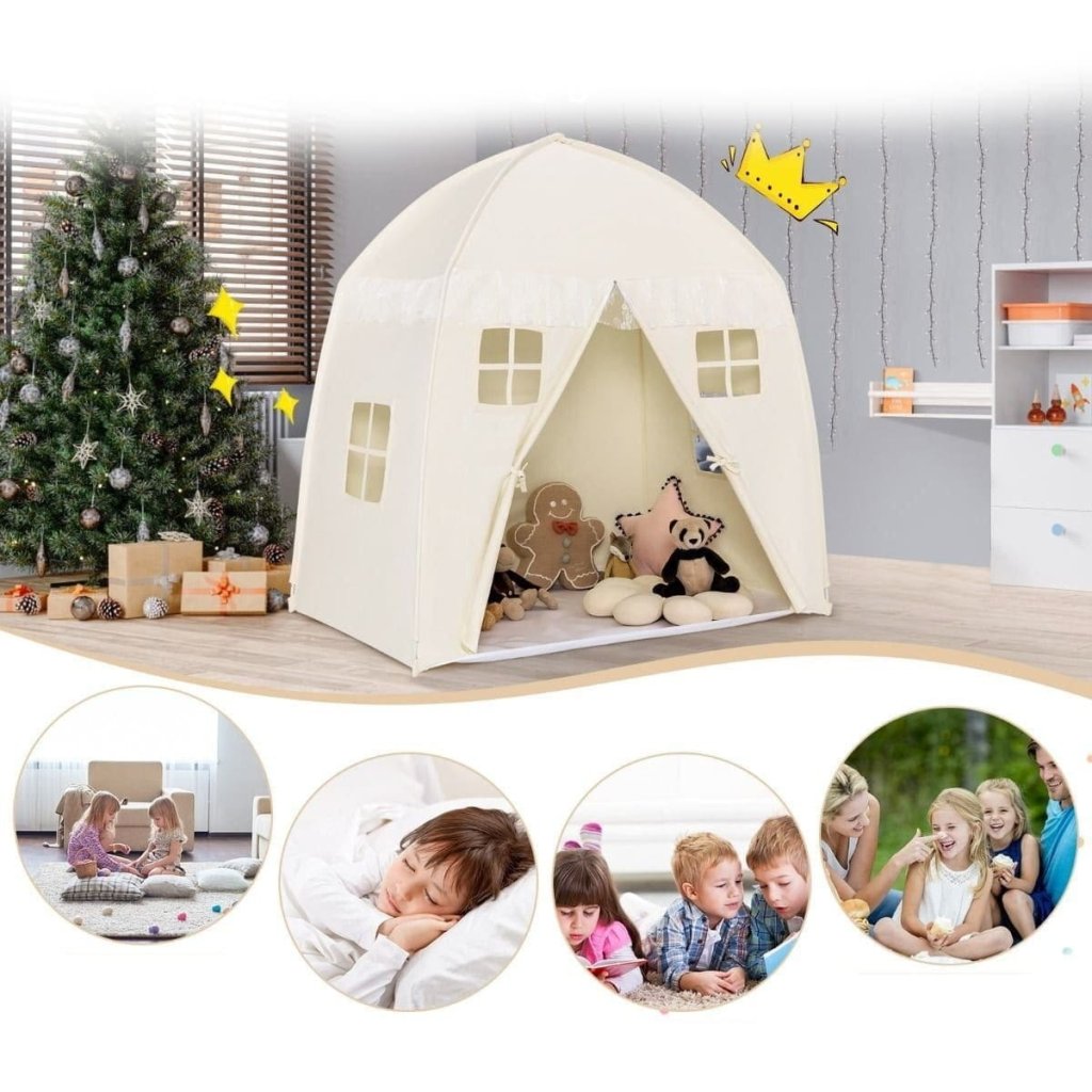 Mit seinem eleganten und charmanten Äußeren wird dieses Spielhaus die Aufmerksamkeit der Kinder auf sich ziehen und ist zweifellos das perfekte Geschenk für Ihre Prinzessin. Jedes Kind sollte seine eigene geheime Basis haben, um seine eigene Innovation und sein unabhängiges Denken zu entwickeln. Das Haus ist mit Vorhängen, hübschen Fenstern, Lichtern und bunten Fahnen geschmückt. Dieses Design macht das Zelt Tag und Nacht zu einem magischen Ort, der Kinder zu endlosem Spaß, Partys oder Filmabenden einlädt.