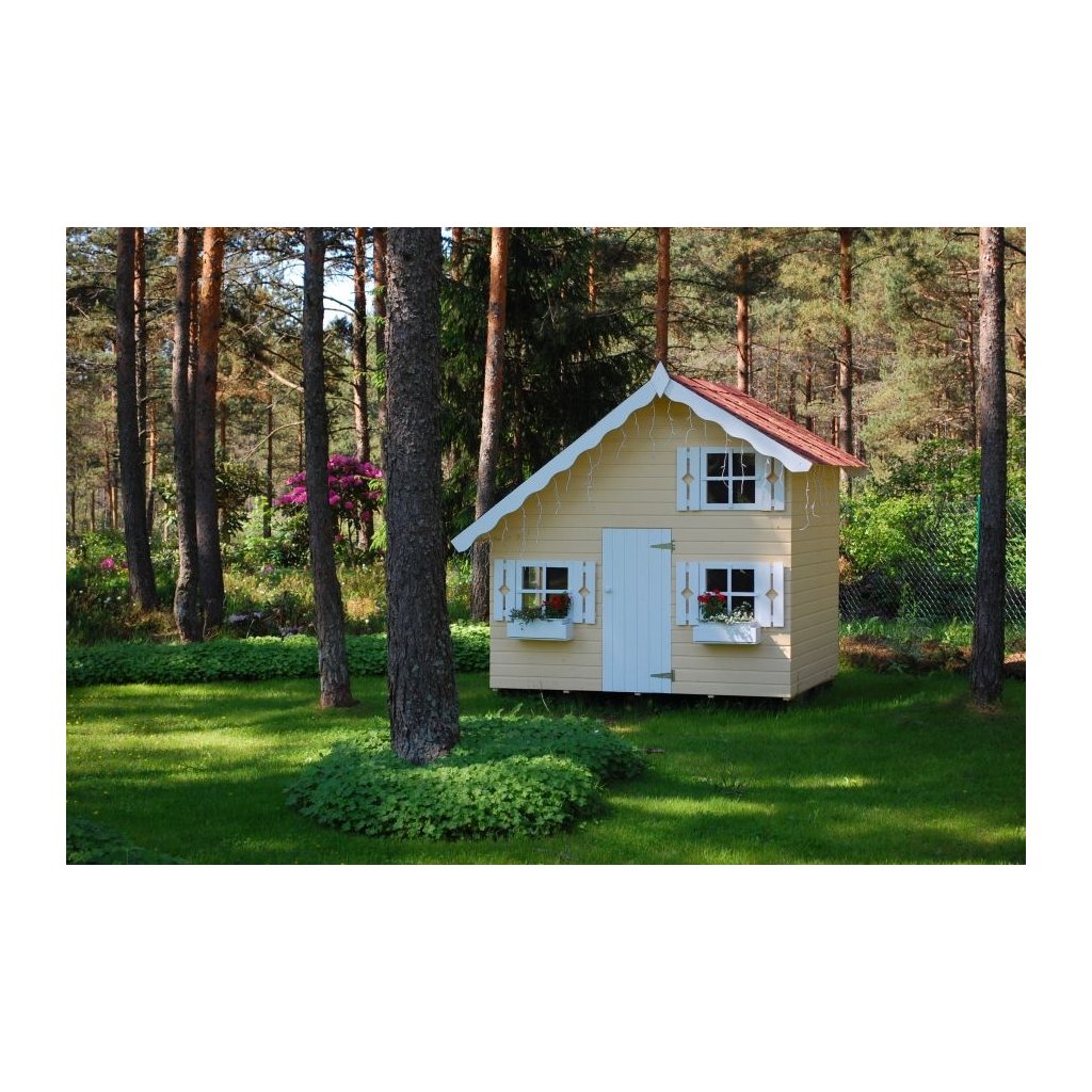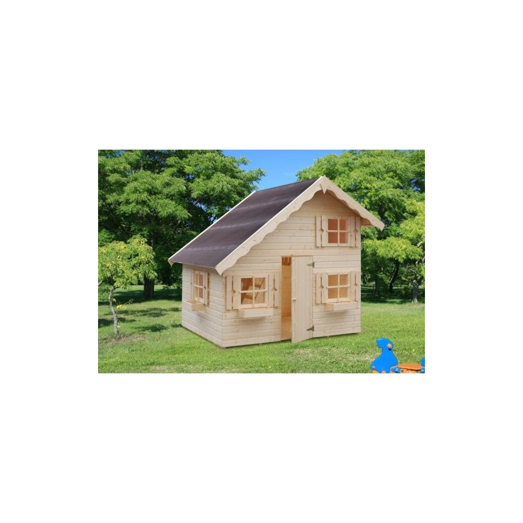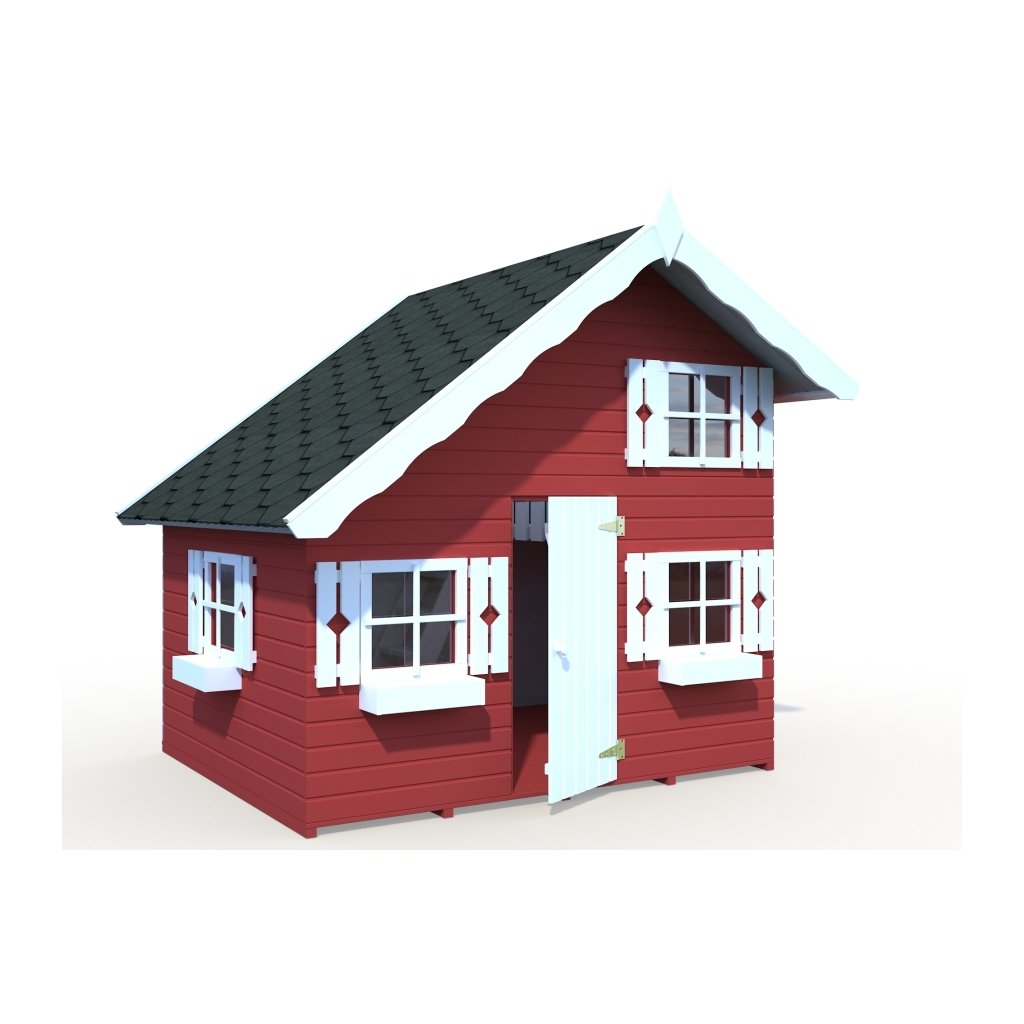 Das zweistöckige Kinderhaus Tom mit einem Volumen von 6,5 m3, hergestellt aus hochwertigem Material, ist aus dicken Holzwänden - 16 mm - Paneel-Typ hergestellt.