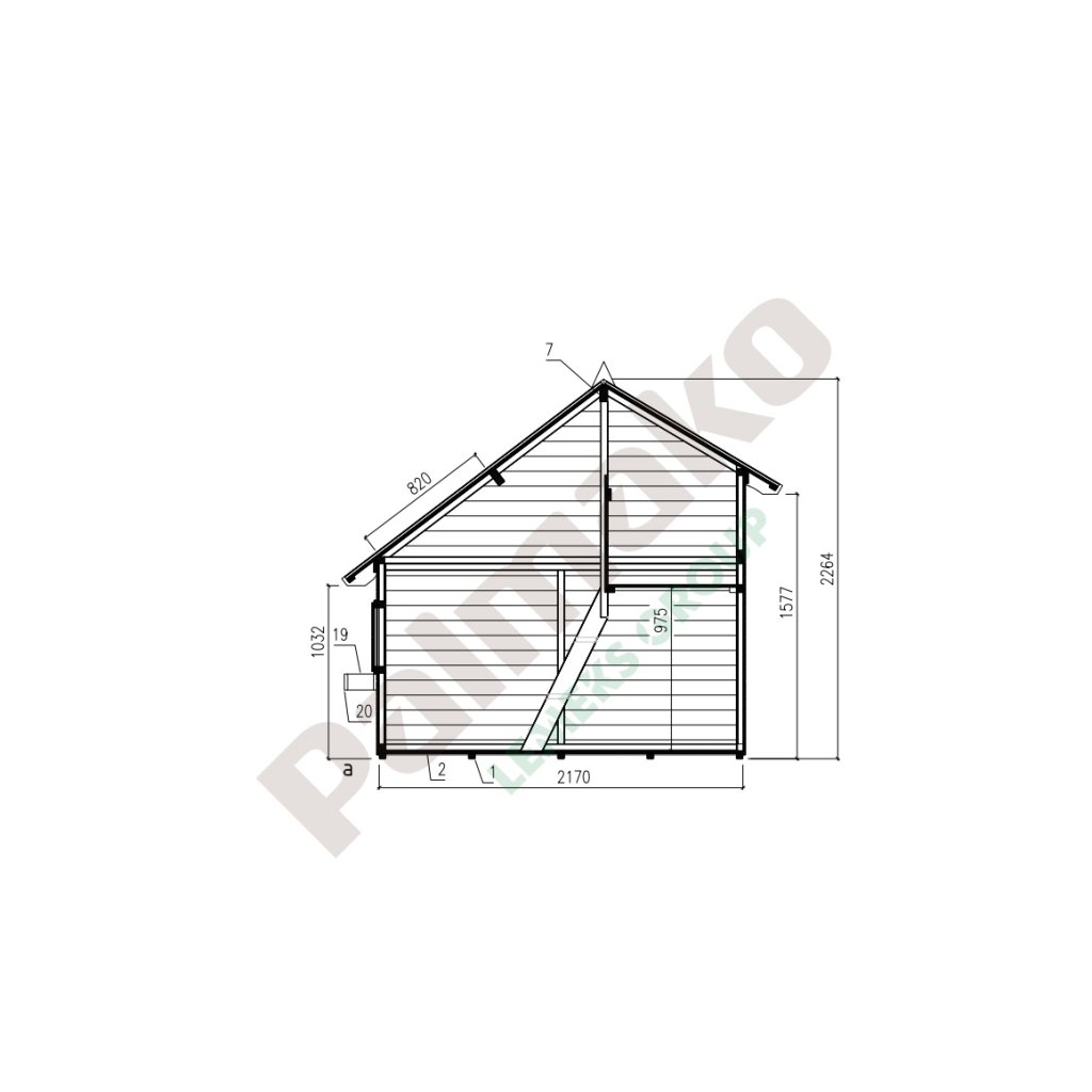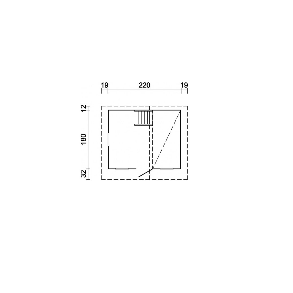 Das Haus hat ein Fenster von 35 x 35 cm, gefüllt mit Plexiglas. Der Zugang zum Haus erfolgt über eine Tür mit den Maßen 48 x 115 cm, die nach außen geöffnet werden kann. Der Überstand der Vorderwand beträgt 32 cm, die Höhe der Wand 125/177 cm, die Höhe des Firstes 228 cm.